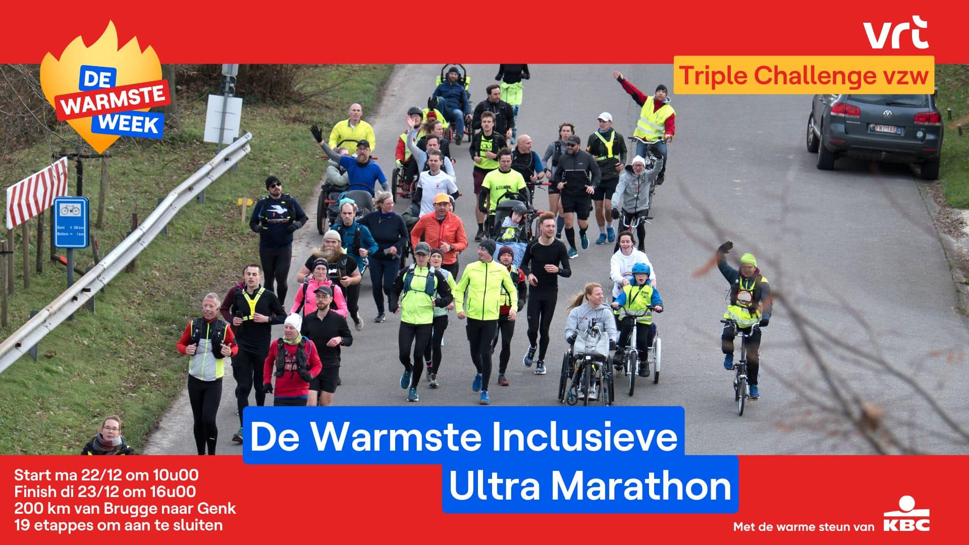Op 22 en 23 december organiseren we opnieuw de Warmste Inclusieve Ultra Marathon, een unieke tocht ten voordele van De Warmste Week. In één groep van lopers, rolstoelatleten, handbikers, fietsers en genieters leggen we maar liefst 200 kilometer af in 30 uur: van ’t Zand in Brugge tot het Warmste Plein van 2025 in het Cosmogolempark in Genk. Deelnemers kiezen zelf aan welke etappes ze meedoen.